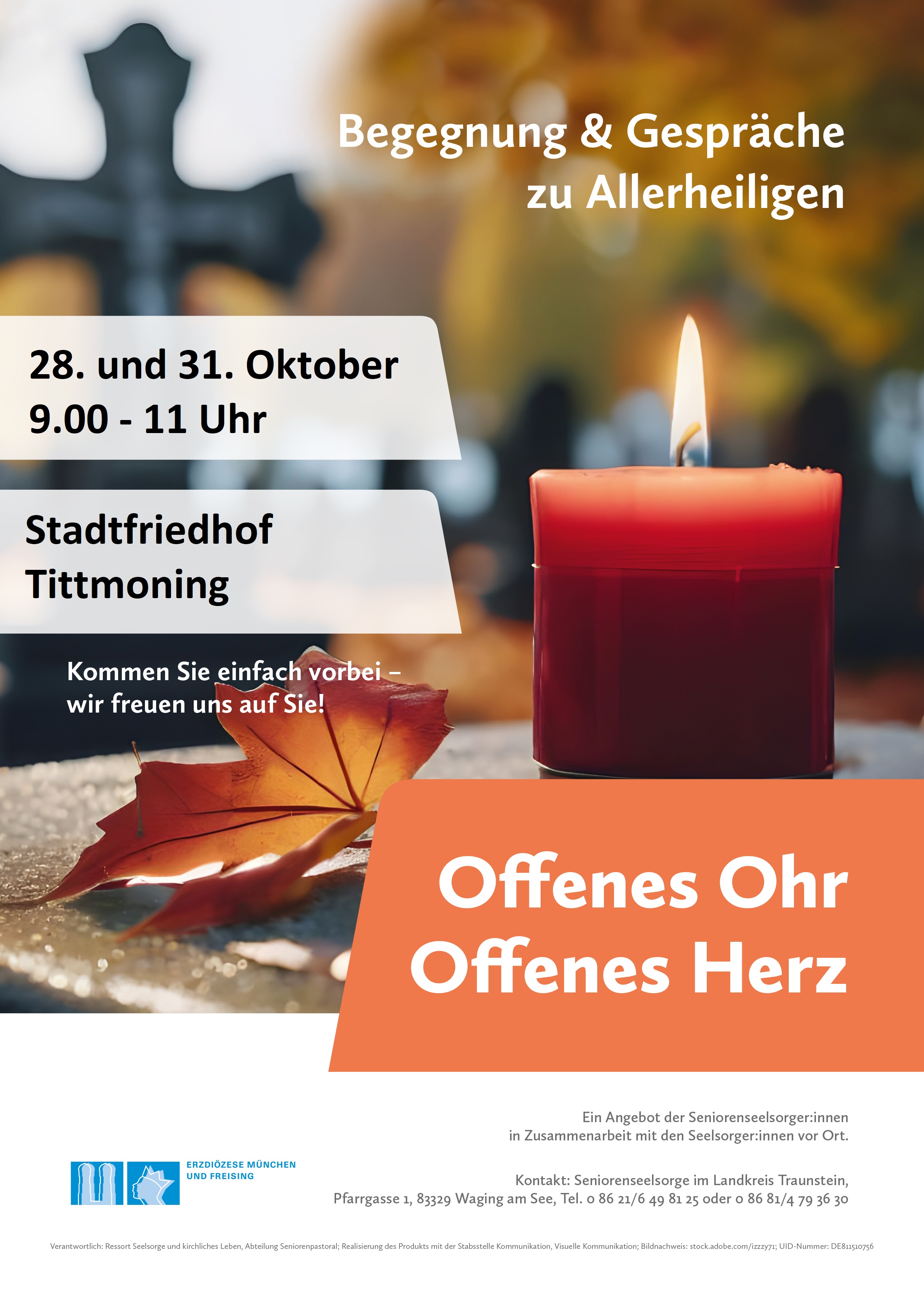 Die Seniorenseelsorge des Dekanates Traunstein und die Seelsorger:innen vor Ort möchten den Betroffen auf den gemeindlichen Friedhöfen die Gelegenheit zu einem Gespräch und zur Begegnung bieten. Dieses Angebot steht zu den angegebenen Zeiten allen offen, unabhängig von ihrer Religionszugehörigkeit.